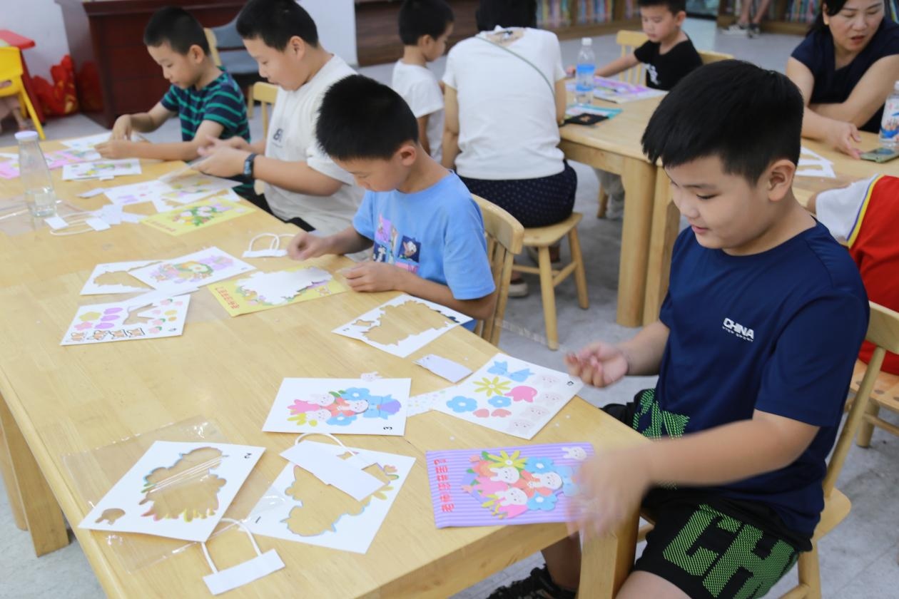 手工区的桌面上铺满彩纸、花朵和彩带,孩子们正专注地创作教师节贺卡。有的将卡纸剪成拼图形状组成爱心图案,还有的别出心裁地加入立体机关——打开卡片就会弹出盛开的康乃馨。这些充满童趣的设计里,藏着孩子们对老师点点滴滴的观察与感激。志愿者老师还特意准备了密封袋,方便保存这些承载着心意的手工艺品。